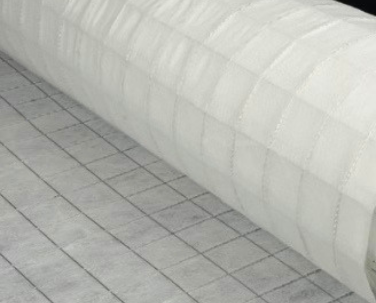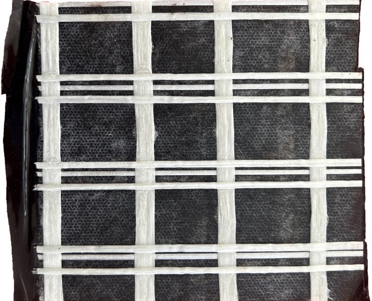 Grille en fibre de verre de 100 kN/m associée à un film de bitume de 1100 g/m et un adhésif fortement polymérisé.